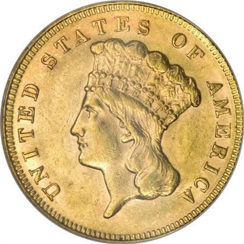 <B>1878 $3 MS62 NGC.</B></I> This canary-gold representative has ample luster, and field marks are limited to minor contact beneath the date. The high points show slight blending of detail, but the eye appeal is undeniable. The 1878 is always available for a price, but demand from gold type set collectors remains insatiable.<BR><BR><B>Coin Engraver:</B> James B. Longacre<BR><BR><b>Shipping:</b> Coins & Currency (<a target="_blank" href="http://www.heritageauctions.com/common/shipping.php">view shipping information</a>)