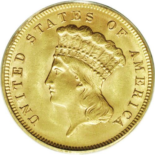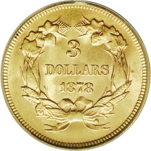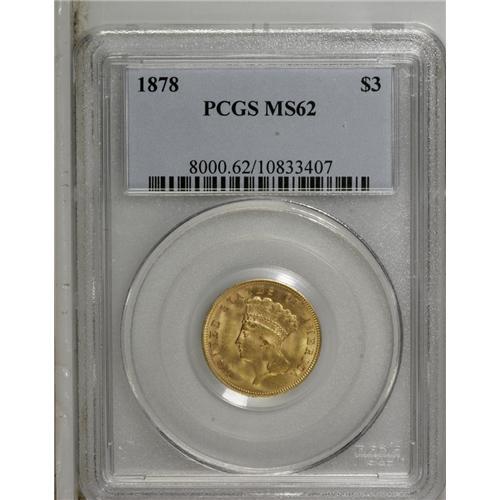 <B>1878 $3 MS62 PCGS.</B></I> Apricot-gold surfaces have soft luster and display traces of light green and tan. The design features are generally well impressed, with strong definition on all of the reverse letters and numerals. A few insignificant light handling marks are noted, and prominent clash marks are absent.<BR><BR><b>Shipping:</b> Coin/Currency (<a target="_blank" href="http://www.heritageauctions.com/common/shipping.php">view shipping information</a>)