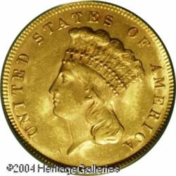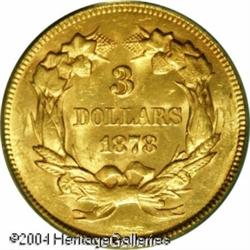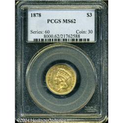 1878 $3 MS62 PCGS. Fully lustrous with a pink-gold <B>1878 $3 MS62 PCGS.</B></I> Fully lustrous with a pink-golden sheen and only a few discreet tiny abrasions preclude a higher rating. Well struck, a desirable type coin candidate. <BR><BR><B>Important notice:</B> Heritage usually auctions material at the rate of 200-250 lots per hour. On some occasions eBay Live bid software or the Internet may not be able to keep up with the pace of the auction. We recommend placing a realistic absentee bid now as insurance to avoid disappointment. Occasionally the auctioneer may eliminate or reject an eBay Live bid, and the auctioneer may also reopen a lot after the close of the eBay live bidding (usually because we missed an audience bid), and may reject your bid even if it shows you as the winning bidder. By bidding via eBay Live, you agree that Heritage may award the lot to another bidder at its sole discretion under the circumstances described above or any other reasonable circumstances. Since eBay bids are not shown to us until we open the lot on the floor, we treat those bids just like floor bids. In most cases the floor responds before the eBay bid is presented to us, due to Internet lag time, so for consistency we have made it a policy that floor bids are always considered first over tie eBay live bids. Also please note that all Heritage lots purchased through eBay Live carry a 20% Buyer's Premium. Please make sure you read the Terms and Conditions before you bid. This lot is being auctioned in conjunction with a live floor auction by Heritage Galleries & Auctioneers. All final auction and invoice information will be supplied by Heritage Galleries & Auctioneers, and all other information should be considered preliminary. Lot:6612