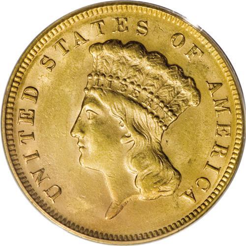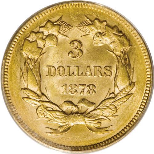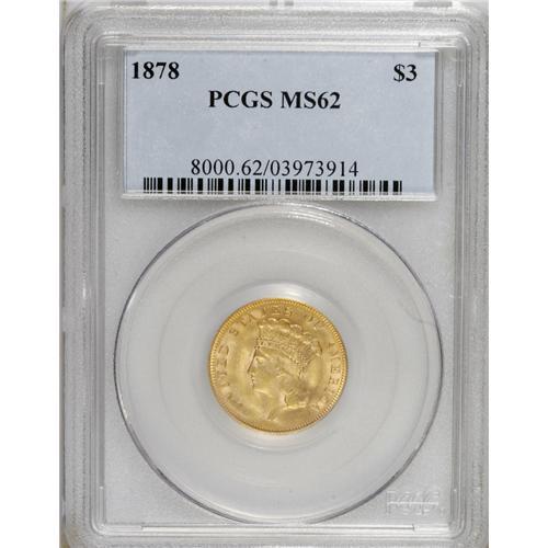 <B>1878 $3 MS62 PCGS.</B></I> Yellow-gold surfaces are imbued with traces of light tan, and display soft luster. Weakness is visible in some of the design elements, especially portions of Liberty's hair and parts of the reverse wreath. A few light handling marks are visible on each side. Jeff Garrett and Ron Guth (2006) write that the 1878 is the most common date of the three dollar gold series.<BR><BR><b>Shipping:</b> Coins & Currency (<a target="_blank" href="http://www.heritageauctions.com/common/shipping.php">view shipping information</a>)