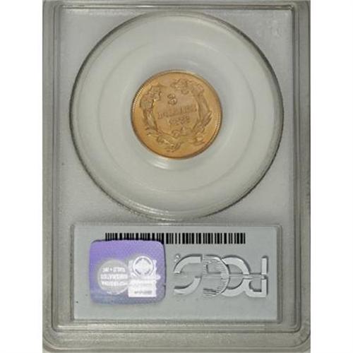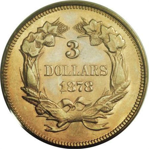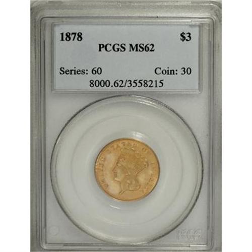 <B>1878 $3 MS62 PCGS.</B></I> A plentiful date, and one of three issues that are most often selected for type collections, along with 1854 and 1874. Lustrous surfaces exhibit a mixture of lemon-yellow and light olive, with just a few of the usual abrasions encountered at the grade. A lovely representative of the date and denomination. <BR><BR><B>Coin Engraver:</B> James B. Longacre<BR><BR><b>Shipping:</b> Coins & Currency (<a target="_blank" href="http://www.heritageauctions.com/common/shipping.php">view shipping information</a>)