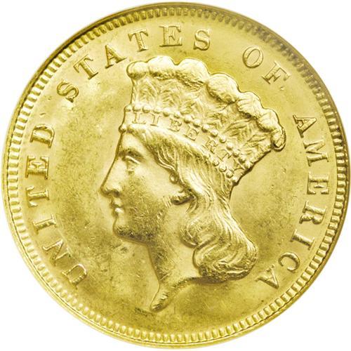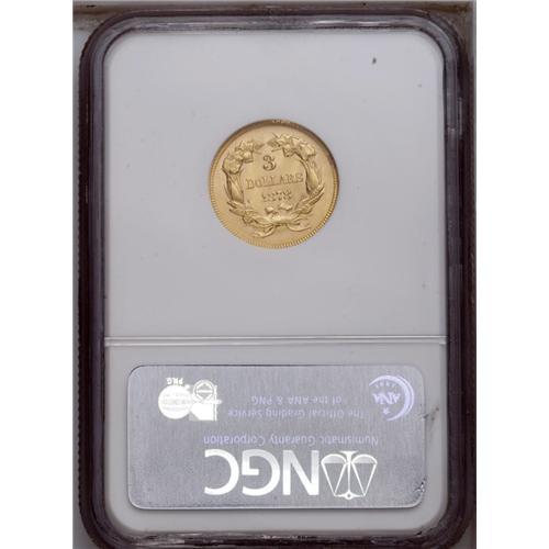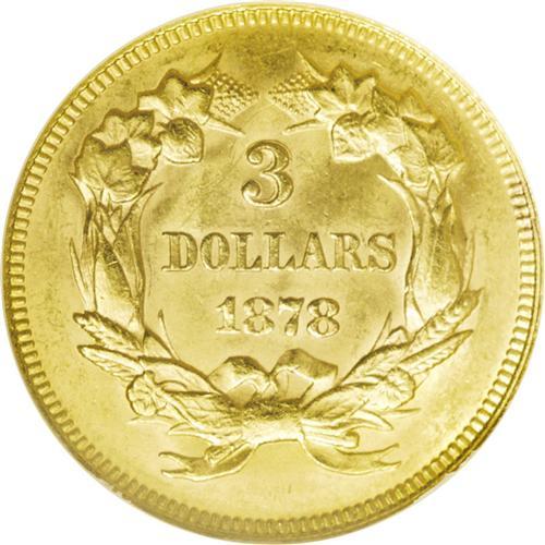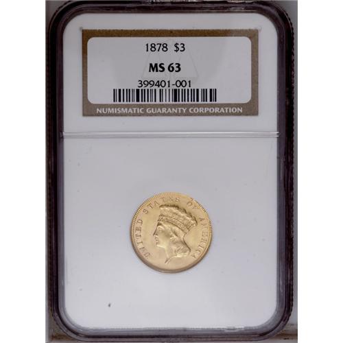 <B>1878<$3> MS63 NGC.</B></I> Thick mint luster is complemented by rich copper-golden color on this lovely, Select Uncirculated example of this unusual yet popular denomination. The striking details are not quite complete, but this is a slight deficiency and is counterbalanced by the clean overall surfaces.