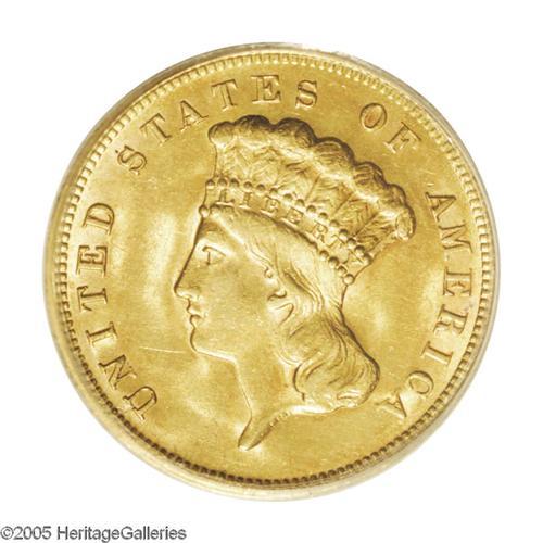 <B>1878<$3> MS63 PCGS.</B></I> This is a vibrant, orange-gold example with no sizeable abrasions on either side. The strike is more than adequate for the series and the luster is frosty in sheen. This coin offers considerable aesthetic appeal for the assigned grade. <BR><I>From The Frank Manthey Collection of Gold Coins.</B></I>