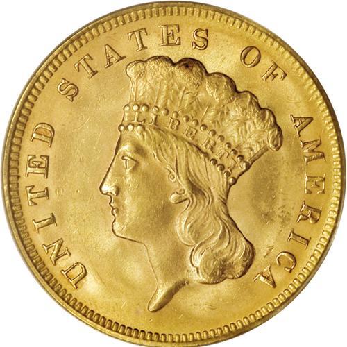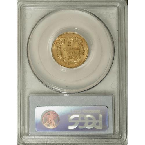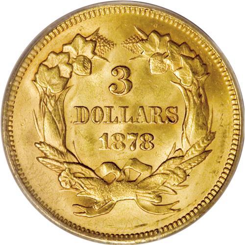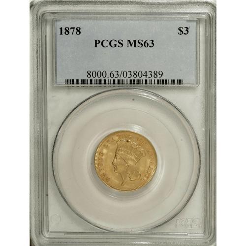 1878 $3 MS63 PCGS. The 82,304-piece business strike mi