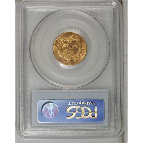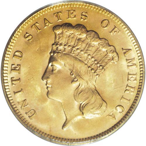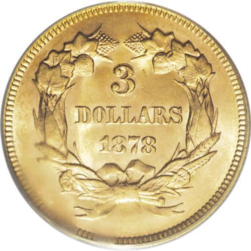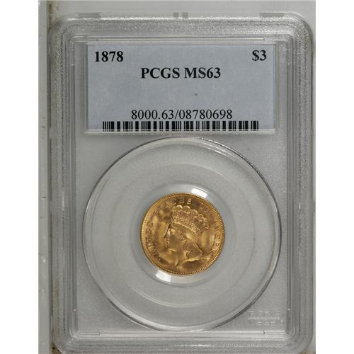 <B>1878 $3 MS63 PCGS.</B></I> Traces of mint-green are mixed in with peach-gold coloration on this select three dollar, and pleasing luster radiates from both sides. Sharply struck on the devices, including the plumes and bowknot, elements that are usually weak. A few minute contact marks account for the grade. Quite impressive overall.<BR><BR><b>Shipping:</b> Coins & Currency (<a target="_blank" href="http://www.heritageauctions.com/common/shipping.php">view shipping information</a>)