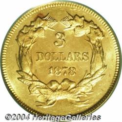 <table><tr><td><table><tr><td>1878 $3 MS63 PCGS. Universally recognized as the type coin from the three dollar series, this particular coin has a certain charm and eye appeal that sets it apart from other MS63 examples of this date. The fields are bright with a confirmed semi-prooflike gleam and very little cartwheel intermixed, which places it close to the prooflike category. A bit softly struck, as usual, the surfaces are lightly abraded, and there is a lovely intermingling of reddish color with the natural green-gold coloration of the planchet. <BR><BR><B>Important notice:</B> Heritage usually auctions material at the rate of 200-250 lots per hour. On some occasions eBay Live bid software or the Internet may not be able to keep up with the pace of the auction. We recommend placing a realistic absentee bid now as insurance to avoid disappointment. Occasionally the auctioneer may eliminate or reject an eBay Live bid, and the auctioneer may also reopen a lot after the close of the eBay live bidding (usually because we missed an audience bid), and may reject your bid even if it shows you as the winning bidder. By bidding via eBay Live, you agree that Heritage may award the lot to another bidder at its sole discretion under the circumstances described above or any other reasonable circumstances. Since eBay bids are not shown to us until we open the lot on the floor, we treat those bids just like floor bids. In most cases the floor responds before the eBay bid is presented to us, due to Internet lag time, so for consistency we have made it a policy that floor bids are always considered first over tie eBay live bids. Also please note that all Heritage lots purchased through eBay Live carry a 20% Buyer's Premium. Please make sure you read the Terms and Conditions before you bid. <BR><BR><B>IMPORTANT ANNOUNCEMENT ABOUT RESERVES:</B> Heritage now divulges all reserves on its web site 7 days before every auction. If you want to know whether the reserve on this lot has been met, and if not, what the reserve amount is, please visit this lot page on the HeritageCoin.com web site, or email: bid@HeritageGalleries.com </span></font></td></tr></table></td></tr></table>