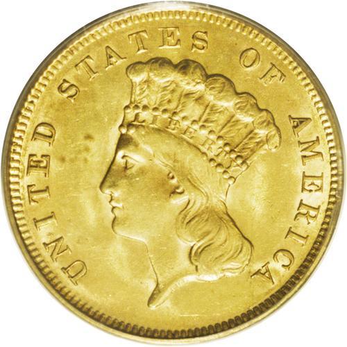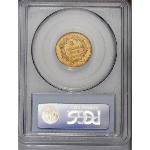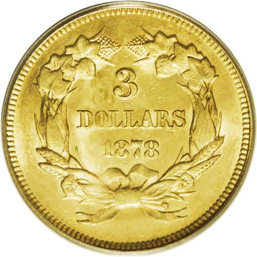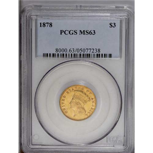 <B>1878<$3> MS63 PCGS.</B></I> While it is viewed as a relatively common issue by specialists, among non-specialists, the 1878 three dollar gold piece has its own mystique as the perfect type coin. The mintage of 82,304 business strikes, second-highest in the series, is just one of the factors. Others include the frosty luster evident on most examples, including this one; a wide range of colors, from light green to the orange-gold of this coin, almost all of them vivid; and the circumstances that led to many examples being stored in bank vaults, away from circulation. The present example has few marks, most of which appear on the reverse, though some striking weakness on the hair does limit the technical grade. Overall, a pleasing example with excellent eye appeal.