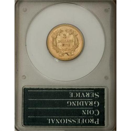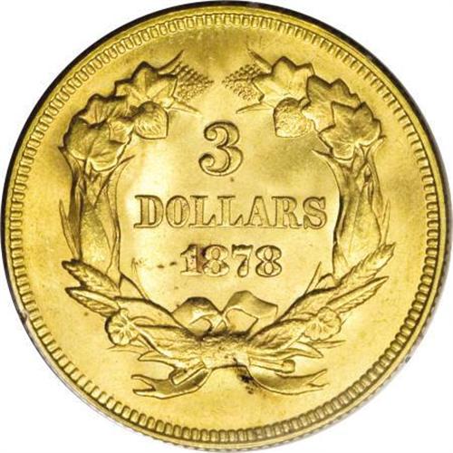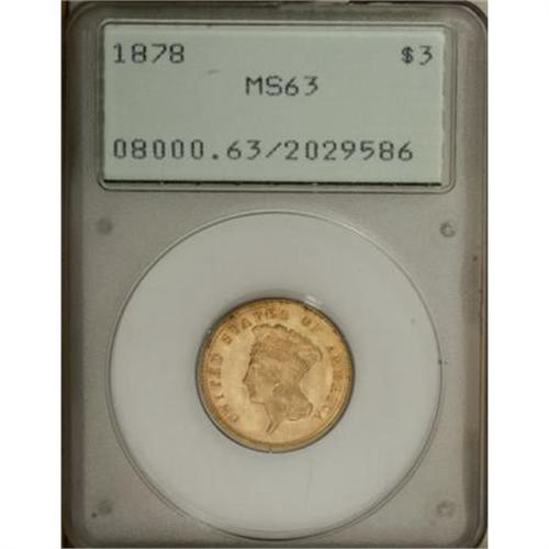 <B>1878 $3 MS63 PCGS.</B></I> An attractive MS63 representative from this always-popular odd-denomination type issue, solidly struck with vibrant, swirling luster and hints of alloy against the wheat-gold of the surfaces. Excellent overall definition with just a touch of haze over each side, and while the portrait shows a handful of tiny abrasions, the overall visual appeal is high. Housed in an early PCGS holder.<BR><BR><B>Coin Engraver:</B> James B. Longacre<BR><BR><b>Shipping:</b> Coins & Currency (<a target="_blank" href="http://www.heritageauctions.com/common/shipping.php">view shipping information</a>)
