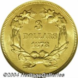 <table><tr><td><table><tr><td>1878 $3 MS64 NGC. A beautiful Three Dollar gold piece that has silky smooth, lustrous surfaces that are unaffected by any large or distracting blemishes. The thick mint frost has taken on a bright, honey-gold appearance on each side. A must-see coin for anyone searching for just the right piece for a type set. <BR><BR><B>Important notice:</B> Heritage usually auctions material at the rate of 200-250 lots per hour. On some occasions eBay Live bid software or the Internet may not be able to keep up with the pace of the auction. We recommend placing a realistic absentee bid now as insurance to avoid disappointment. Occasionally the auctioneer may eliminate or reject an eBay Live bid, and the auctioneer may also reopen a lot after the close of the eBay live bidding (usually because we missed an audience bid), and may reject your bid even if it shows you as the winning bidder. By bidding via eBay Live, you agree that Heritage may award the lot to another bidder at its sole discretion under the circumstances described above or any other reasonable circumstances. Since eBay bids are not shown to us until we open the lot on the floor, we treat those bids just like floor bids. In most cases the floor responds before the eBay bid is presented to us, due to Internet lag time, so for consistency we have made it a policy that floor bids are always considered first over tie eBay live bids. Also please note that all Heritage lots purchased through eBay Live carry a 20% Buyer's Premium. Please make sure you read the Terms and Conditions before you bid. <BR><BR><B>IMPORTANT ANNOUNCEMENT ABOUT RESERVES:</B> Heritage now divulges all reserves on its web site 7 days before every auction. If you want to know whether the reserve on this lot has been met, and if not, what the reserve amount is, please visit this lot page on the HeritageCoin.com web site, or email: bid@HeritageGalleries.com </span></font></td></tr></table></td></tr></table>