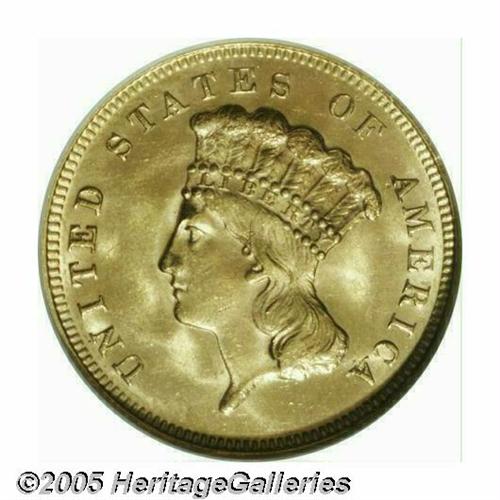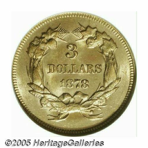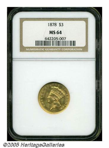 <B>1878<$3> MS64 NGC.</B></I> Beautiful pink and copper-gold colors adorn the well struck, highly lustrous surfaces. A number of small field marks are evident on both obverse and reverse, but they are extremely superficial in nature. An unusually attractive, high-end near-Gem.