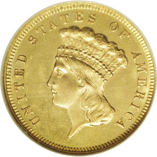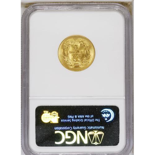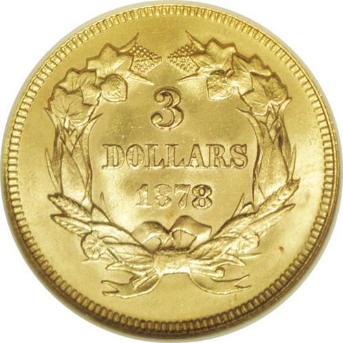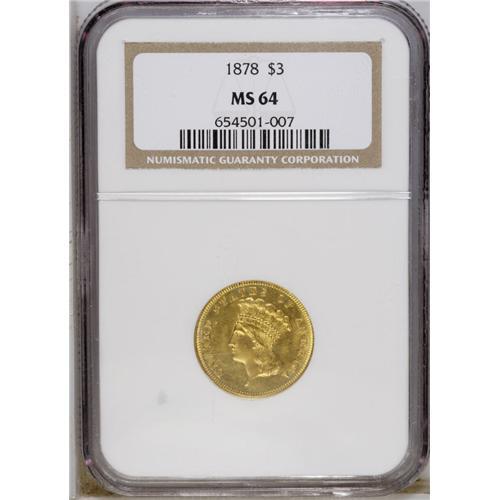 <B>1878 $3 MS64 NGC.</B></I> There is little doubt that this is one of the most plentiful of all three-dollar gold pieces. With a total mintage of 82,304 business strikes, it has the second highest production of the entire series, and few of those entered circulation. This example is sharply struck with highly lustrous satin surfaces and exceptional bright yellow color. A few tiny surfaces marks can be seen on each side, mostly within the hidden areas of the design. Breen mentioned three varieties of business strikes, but failed to provide any further details. This example has LIBERTY noticeably doubled.<BR><BR><b>Shipping:</b> Coin/Currency (<a target="_blank" href="http://www.heritageauctions.com/common/shipping.php">view shipping information</a>)