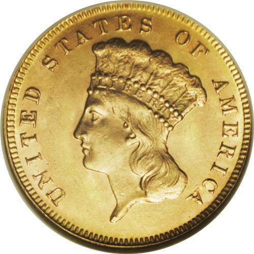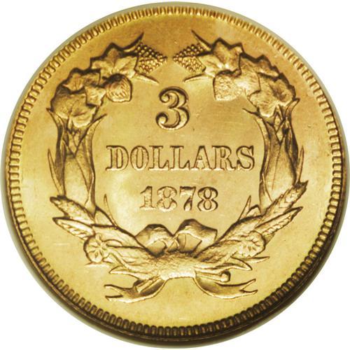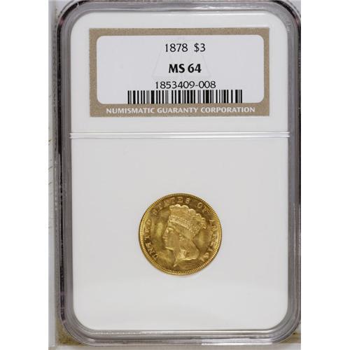 1878 $3 MS64 NGC. This lovely near-Gem has a pleasing,