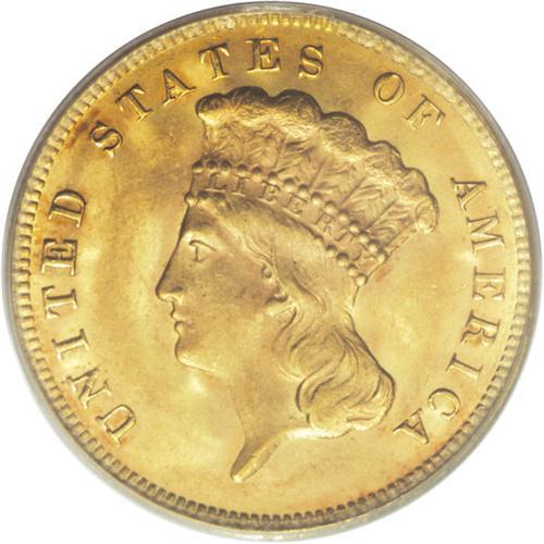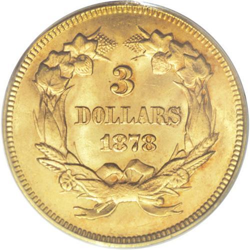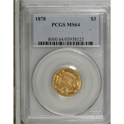 <B>1878 $3 MS64 PCGS.</B></I> For the vast majority of collectors, this gently shimmering pumpkin-gold type coin has only a few tiny marks and no shortage of eye appeal. Well struck except for the knot of the bow and strongly die doubled on the ARS in DOLLARS, as well as on the upper right portion of the wreath. The 8s in the date are also recut within the upper loops.<BR><BR><b>Shipping:</b> Coins & Currency (<a target="_blank" href="http://www.heritageauctions.com/common/shipping.php">view shipping information</a>)