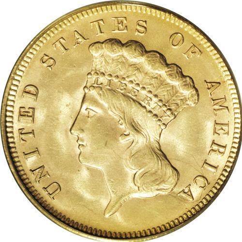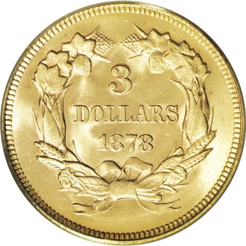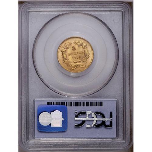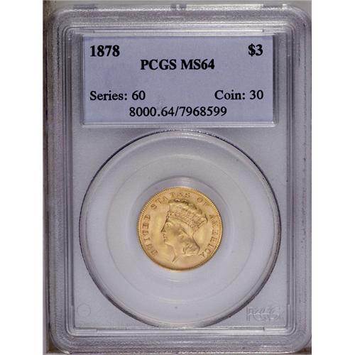 <B>1878<$3> MS64 PCGS.</B></I> According to David Bowers and Doug Winters in <I>The United States Three Dollar Gold Pieces,</B></I> the 1878 three dollar, with a business strike mintage of 82,304 pieces, "... stands as the most plentiful of all dates, by far, in Mint State, giving it 'common' status." Along this line, the authors cite an interview that Bowers had with John J. Ford, Jr., in which the latter related: "... There was a large group of gem 1878 $3 pieces, maybe a thousand or more. I bought about 400 of them, first paying $25 each, then $30. I sold at least 300 of them to Aubrey Bebee ... for $50 each."<BR> This near-Gem specimen features radiant luster and pretty apricot-gold patina with some accents of faded red. The design elements exhibit sharply struck impressions. Minute marks on the cheek and neck and in the obverse fields limit the grade. What appear to be a couple of strands of hair have been trapped in the holder over the lower right obverse.