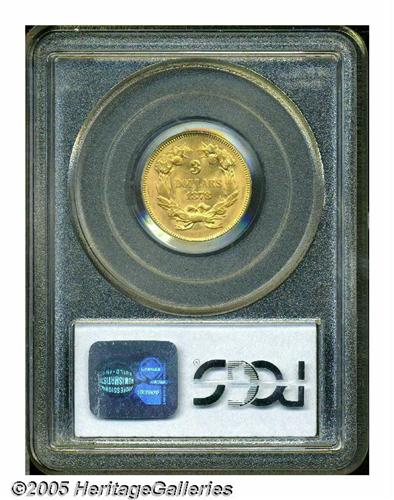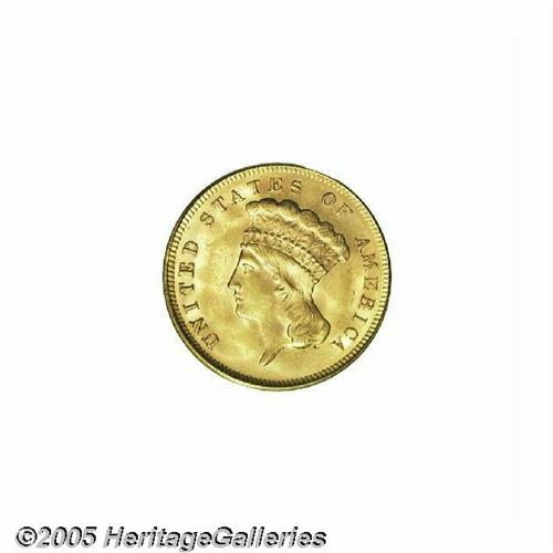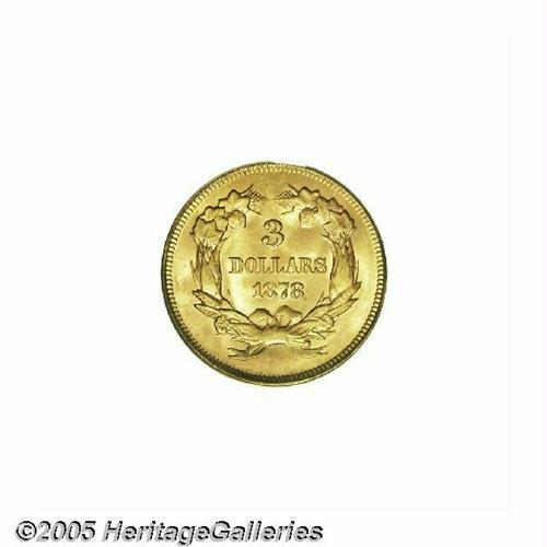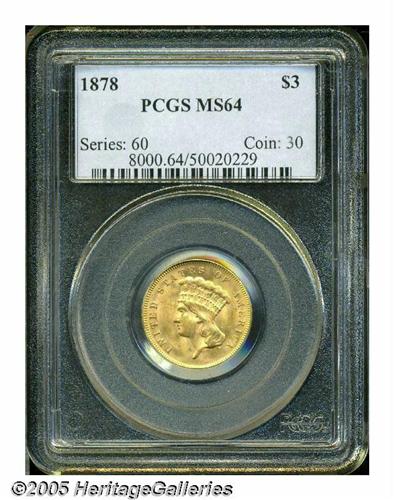 <B>1878<$3> MS64 PCGS.</B></I> An example of the second highest mintage issue, one of 82,324 examples originally coined. Only the debut 1854 issue had a mintage that exceeded 100,000 pieces. This example displays satiny surfaces with a delicate mix of yellow-gold, faint orange, and light green patination. Both sides are awash in marvelous luster, and the design elements are nicely impressed, though some of Liberty's hair curls and the bow knot are a trifle soft. A higher grade is precluded by a few minute marks in the left (facing) obverse field, and a rather innocuous short pinscratch on Liberty's jaw.