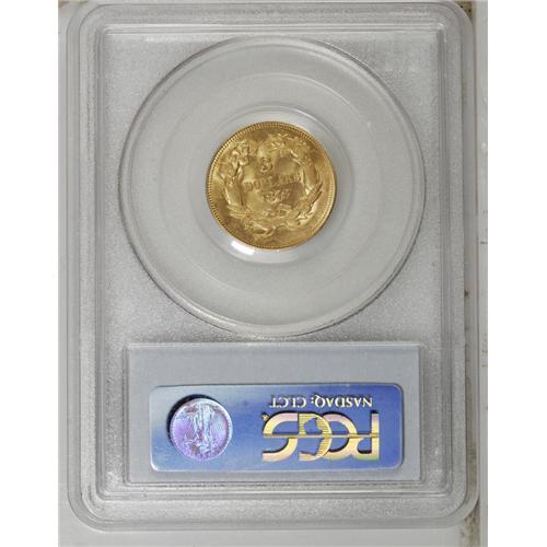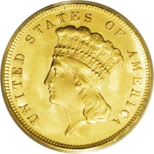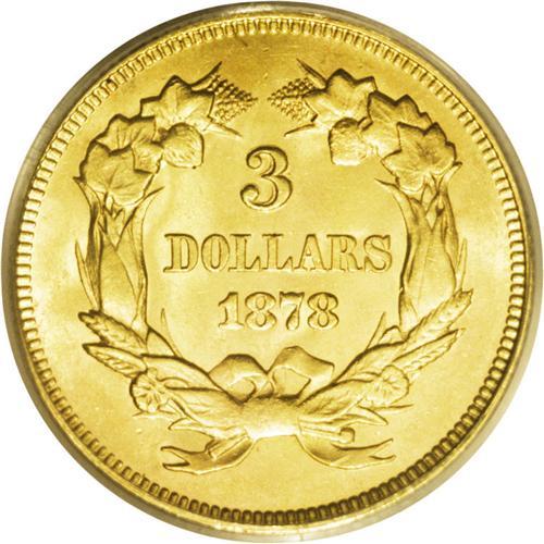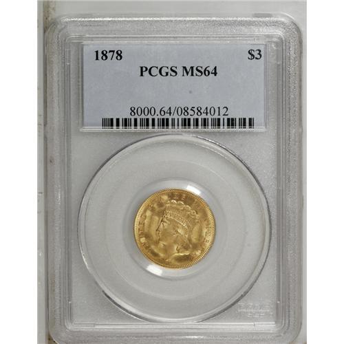 <B>1878<$3> MS64 PCGS.</B></I> Shimmering luster bathes this splendid gold type coin. The strike is sharp except for slight incompleteness on the wreath knot. Careful evaluation beneath a loupe fails to reveal remotely relevant contact, although minor die doubling is present on the right cotton leaves and the ARS in DOLLARS.