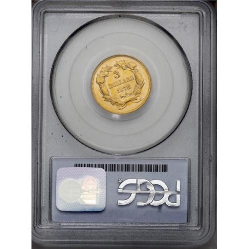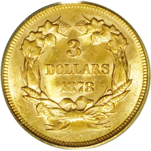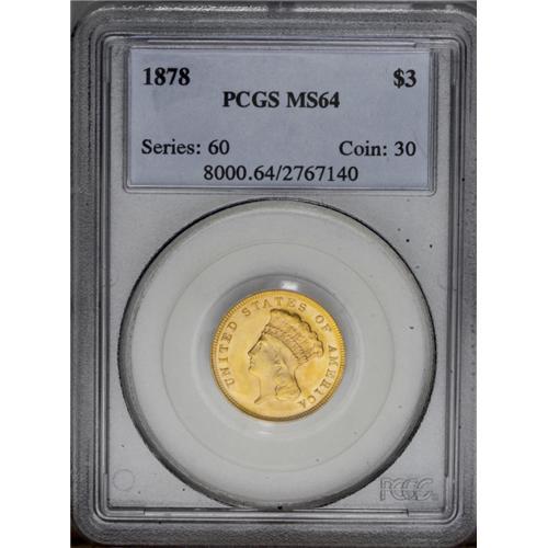 <B>1878<$3> MS64 PCGS.</B></I> The 1878 is the most common three dollar gold price in all grades. If one were to consider the number of quality gold collectors in today's market, however, it would be obvious that the present example is rare from an availability standpoint. All but unsurpassable in the area of eye appeal, the surfaces are aglow with rich orange-gold and pink-gold color combined with shimmering mint brilliance. We can find no fault with the bold striking definition and neither side displays a mentionable surface disruption. About 30 degrees of counterclockwise die rotation is noted. <BR><BR><B>Important notice:</B> Heritage usually auctions material at the rate of 200-250 lots per hour. On some occasions eBay Live bid software or the Internet may not be able to keep up with the pace of the auction. We recommend placing a realistic absentee bid now as insurance to avoid disappointment. Occasionally the auctioneer may eliminate or reject an eBay Live bid, and the auctioneer may also reopen a lot after the close of the eBay live bidding (usually because we missed an audience bid), and may reject your bid even if it shows you as the winning bidder. By bidding via eBay Live, you agree that Heritage may award the lot to another bidder at its sole discretion under the circumstances described above or any other reasonable circumstances. Since eBay bids are not shown to us until we open the lot on the floor, we treat those bids just like floor bids. In most cases the floor responds before the eBay bid is presented to us, due to Internet lag time, so for consistency we have made it a policy that floor bids are always considered first over tie eBay live bids. Also please note that all Heritage lots purchased through eBay Live carry a 20% Buyer's Premium. Please make sure you read the Terms and Conditions before you bid. This lot is being auctioned in conjunction with a live floor auction by Heritage Galleries & Auctioneers. All final auction and invoice information will be supplied by Heritage Galleries & Auctioneers, and all other information should be considered preliminary. Lot:2598 <BR><BR><B>Winning Notification and Billing:</B> After the FINAL session in this auction is complete, Heritage will send e-mail and snail mail invoices. This process normally takes several days. All final auction and invoice information will be supplied by Heritage Galleries & Auctioneers, and all other information should be considered preliminary. <BR><BR>This auction will be conducted on a live auction floor and over the Internet through eBay Live. If you choose to place an absentee bid, please take a moment to <font color='#0000ff'><u><a href='http://pages.ebay.com/liveauctions/help/before/laabsentee.html'>learn how eBay Live absentee bidding works</a></u></font><font color='#000000'>