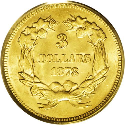 <B>1878<$3> MS64 PCGS.</B></I> The appealing golden surfaces display the usual (almost diagnostic) swirling mint luster, with a slight accent of reddish patina around the margins. This piece is a bit weakly struck on the bowknot on the lower reverse, as usually seen. There are a few small abrasions on each side, none of them singularly distracting, that keep this piece solidly in the MS64 grade range. The generous mintage in excess of 80,000 examples, combined with the numerous Uncirculated examples saved, ensure a steady supply of lovely pieces such as the present example. A good type-coin choice.