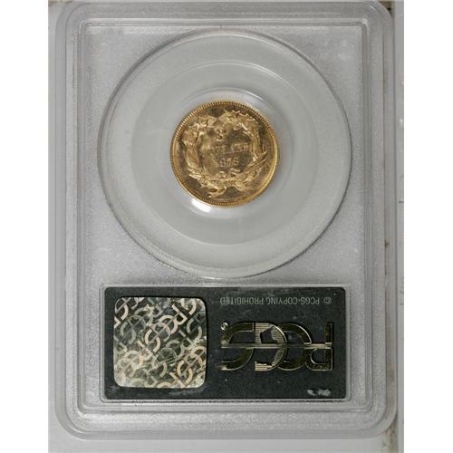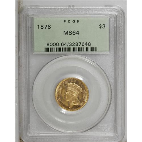 <B>1878<$3> MS64 PCGS.</B></I> The most available date in the series--and yet a coin that can hardly be called "common," considering the low supply of all dates and the unceasing demand from type collectors. This charming example offers bold contrast between the frosty devices and the prooflike honey-gold fields. Examination under a loupe reveals a bit of struck-in die grease that does not affect the numerical grade, along with a bold strike and minuscule light, grade-consistent abrasions.
