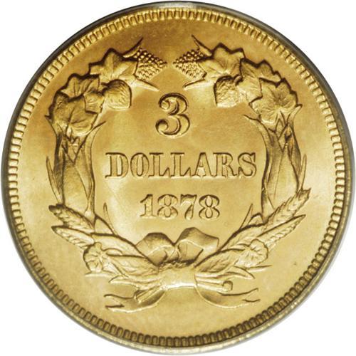 <B>1878 $3 MS64 PCGS.</B></I> The relatively high 1878 three dollar gold production (82,304 pieces) was in part a response to the 1875 government mandate that as of January 1, 1879, gold coins would be exchangeable at par with paper bills (David Bowers and Douglas Winter, 2005). This near-Gem survivor displays apricot-gold color and potent luster. A sharp strike brings out most of the detail on the design features, and just a few minor marks limit the grade.<BR><BR><b>Shipping:</b> Coins & Currency (<a target="_blank" href="http://www.heritageauctions.com/common/shipping.php">view shipping information</a>)