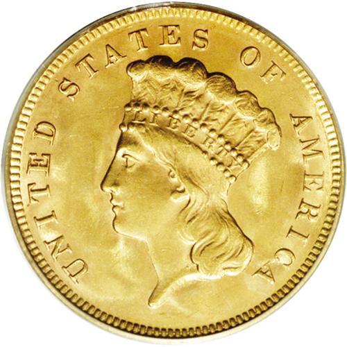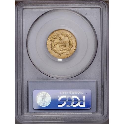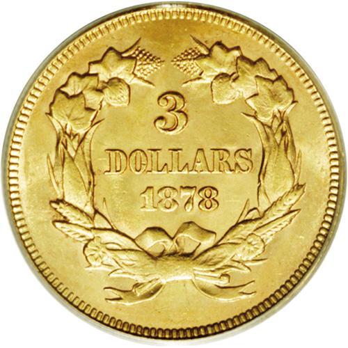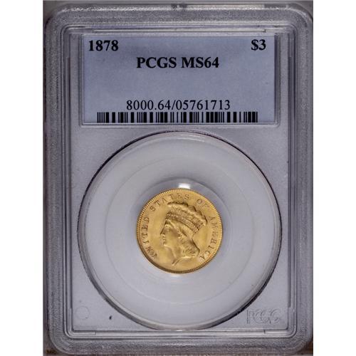 <B>1878<$3> MS64 PCGS.</B></I> The surfaces display the usual (almost diagnostic) swirling mint luster and the golden surfaces show a slight accent of reddish patina around the margins. A bit weakly struck on the ribbon knot on the lower reverse, as usually seen. There are a few small abrasions on each side that keep this piece solidly in the MS64 grade range.