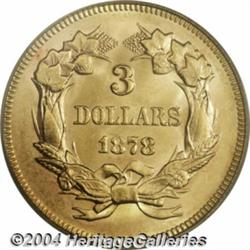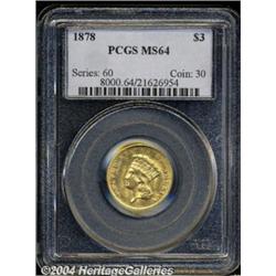 <B>1878<$3> MS64 PCGS.</B></I> Beautiful pink and green-gold colors adorn the well struck, highly lustrous surfaces. A number of small field marks are evident on both obverse and reverse, but they are extremely superficial in nature. An unusually attractive, high-end near-Gem.<BR><I>From The Willamette Collection.</B></I> <BR><BR><B>Important notice:</B> Heritage usually auctions material at the rate of 200-250 lots per hour. On some occasions eBay Live bid software or the Internet may not be able to keep up with the pace of the auction. We recommend placing a realistic absentee bid now as insurance to avoid disappointment. Occasionally the auctioneer may eliminate or reject an eBay Live bid, and the auctioneer may also reopen a lot after the close of the eBay live bidding (usually because we missed an audience bid), and may reject your bid even if it shows you as the winning bidder. By bidding via eBay Live, you agree that Heritage may award the lot to another bidder at its sole discretion under the circumstances described above or any other reasonable circumstances. Since eBay bids are not shown to us until we open the lot on the floor, we treat those bids just like floor bids. In most cases the floor responds before the eBay bid is presented to us, due to Internet lag time, so for consistency we have made it a policy that floor bids are always considered first over tie eBay live bids. Also please note that all Heritage lots purchased through eBay Live carry a 20% Buyer's Premium. Please make sure you read the Terms and Conditions before you bid. </span></font></tr></table></td></tr></table>