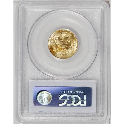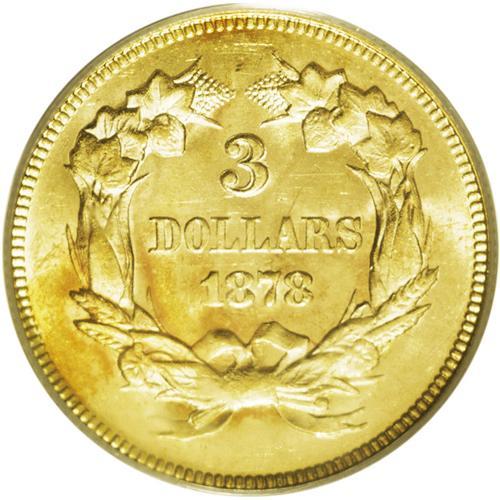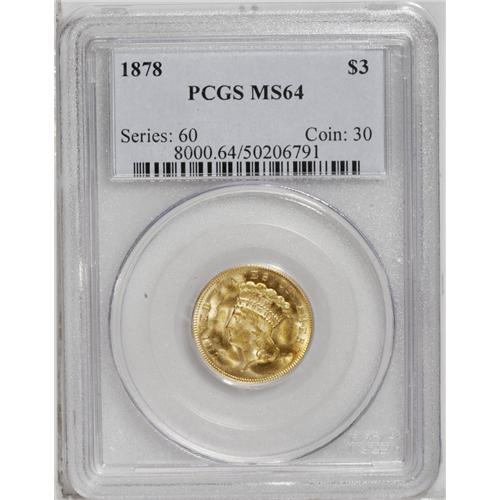 <B>1878<$3> MS64 PCGS.</B></I> Both type collectors and series specialists compete for the best examples of the 1878 three dollar gold piece. In light of the comparatively large number of pieces available for this issue, the advanced collector demands a quality coin that has outstanding eye appeal. This near-Gem has a striking appearance, with intriguing, satiny luster separated into several whorls on the surfaces. The fields are dominated by yellow-gold color, but traces of vivid orange appear on the obverse that hint at a larger patch of color on the other side. With such exceptional texture and color combined with the above-average strike, the relative paucity of marks seem to fade in importance, though the technical grade is still influenced by some tiny abrasions away from the prime focal areas. A great example sure to please whomever buys it. <BR><BR><B>Importa