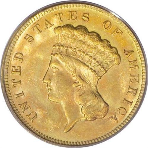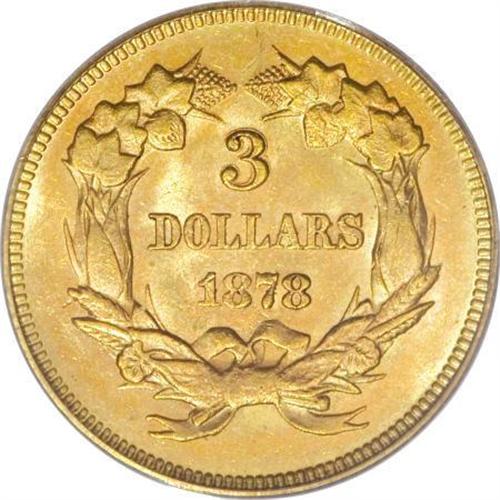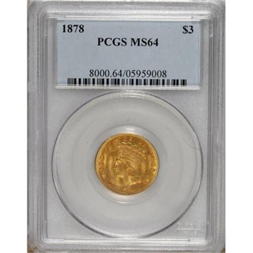 <B>1878 $3 MS64 PCGS.</B></I> The 1878 is the most frequently encountered three dollar and is most commonly used for type purposes. For the collector who wants something extra, this piece has rich, original rose and lilac patina interspersed over each side. As usual, the mint luster is thick and frosted and on this piece further enhances the lovely colors. Lightly abraded, as one would expect from an MS64.<BR><BR><b>Shipping:</b> Coins & Currency (<a target="_blank" href="http://www.heritageauctions.com/common/shipping.php">view shipping information</a>)