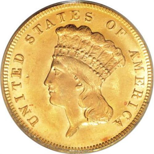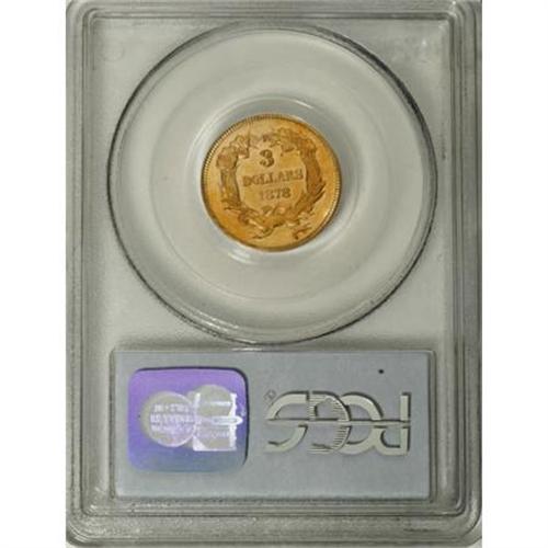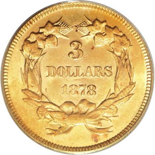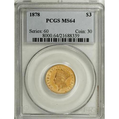 <B>1878 $3 MS64 PCGS.</B></I> Jeff Garrett and Ron Guth (2006) write that the 1878 three dollar is the most common date of the series. The several thousand pieces certified by PCGS and NGC tends to corroborate the authors' contention. Radiant luster exudes from apricot-gold surfaces of this near-Gem example, and a well directed strike brings about sharp definition on the motifs, save for the usually-seen soft lower wreath. Some minor handling marks define the grade.<BR><BR><B>Coin Engraver:</B> James B. Longacre<BR><BR><b>Shipping:</b> Coins & Currency (<a target="_blank" href="http://www.heritageauctions.com/common/shipping.php">view shipping information</a>)