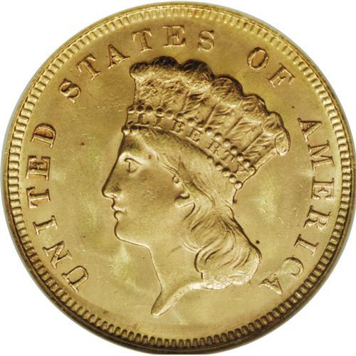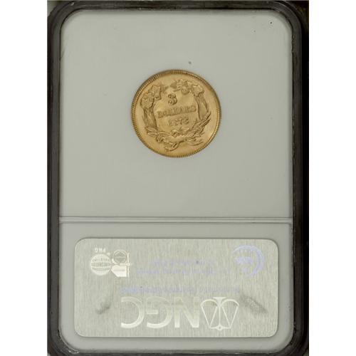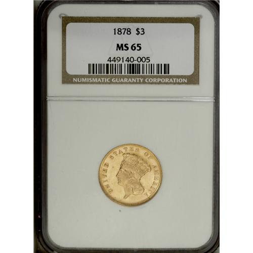 <B>1878 $3 MS65 NGC.</B></I> This sparkling Gem displays an effulgent, frosty sheen that radiates palpably over both sides. The tantalizing, light yellow-gold and faintly reddish toning is likewise lovely to behold. All of the design elements are well formed from an obviously sharp striking impression. According to Garrett and Guth (2006): "The 1878 $3 gold piece is the most common date of the series, by far. More than 8,000 examples have been certified by ANACS, PCGS, and NGC combined, more than double that of 1854 and 1874. Uncirculated specimens are very common, even through MS-65. In MS-66, the population begins to drop off and the finest examples stop at MS-67. The 1878 issue usually features a rich, coruscating luster and good to great eye appeal."<BR><BR><b>Shipping:</b> Coin/Currency (<a target="_blank" href="http://www.heritageauctions.com/common/shipping.php">view shipping information</a>)