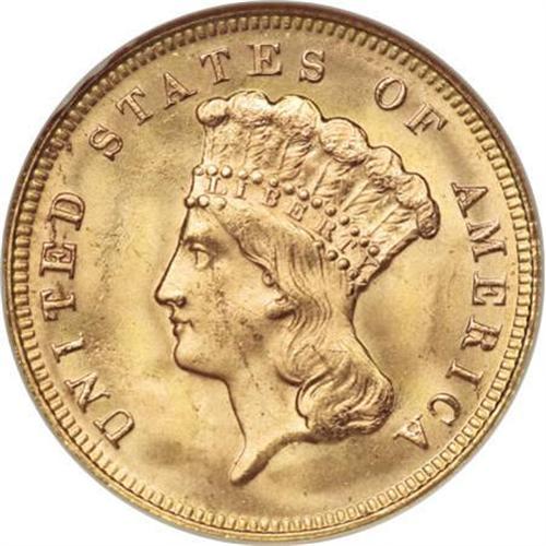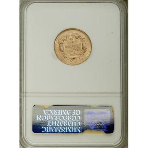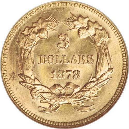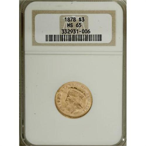 <B>1878 $3 MS65 NGC.</B></I> The 1878 three dollar piece, coming from a mintage of 82,304 business strikes, is probably the most plentiful of all dates in Mint State, giving it "common" status. That said, David Bowers writes in his three dollar gold piece reference (2005), that "the typical Mint State coin is in a lower range with a generous quotient of bagmarks, probably from having been tossed around in bags stored in banks." The NGC/PCGS population data support Bowers' contention, as MS65 and better 1878 three dollar coins comprise a small percentage of the total number of pieces certified.<BR> The current Gem is awash in dazzling brassy-gold luster, and displays sharply struck design features, save for the usual softness on the bowknot. A few obverse luster grazes do not take away from the coin's overall pleasing eye appeal. This is an ideal coin for a high grade type collection.<BR><I>From The Florissant Collection.</B></I><BR><BR><B>Coin Engraver:</B> James B. Longacre<BR><BR><b>Shipping:</b> Coins & Currency (<a target="_blank" href="http://www.heritageauctions.com/common/shipping.php">view shipping information</a>)
