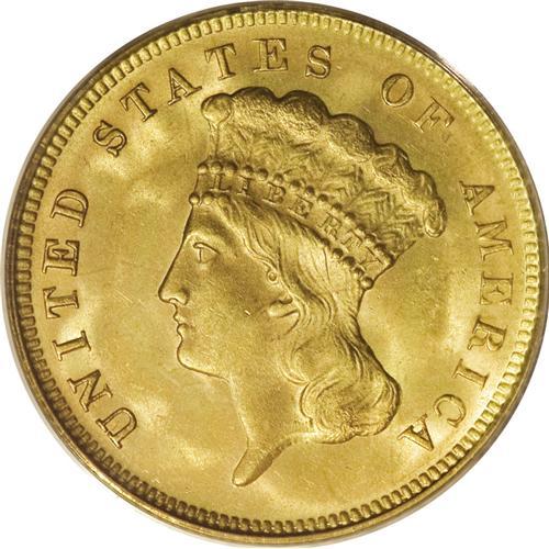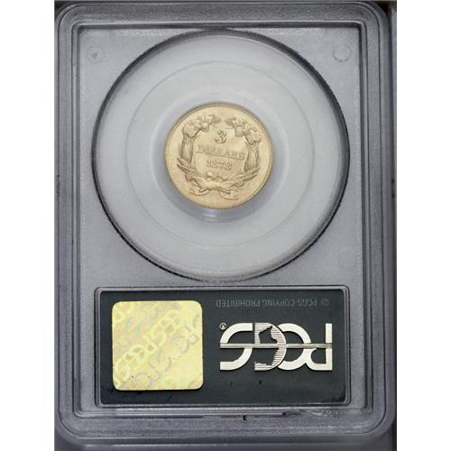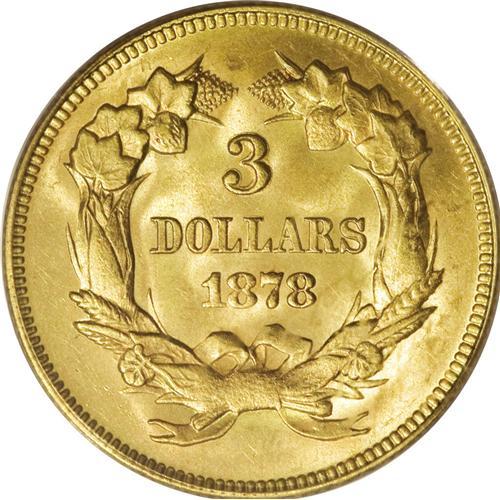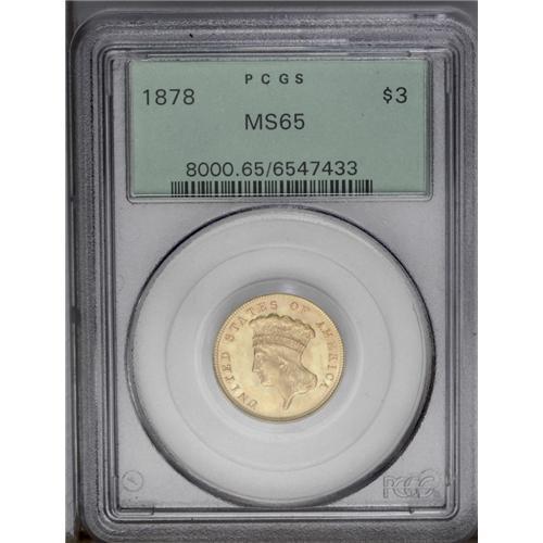 <B>1878 $3 MS65 PCGS.</B></I> In anticipation of gold being exchangeable at par with paper money on January 1, 1879, as mandated by the Specie Redemption Act of 1875, the Mint produced considerable numbers of gold coins, including 82,304 business strikes of the 1878 three dollar gold. The market achieved parity on its own in late December--but when the public realized they could exchange paper money for gold whenever they wanted, a giant collective yawn was the result. Most of the freshly minted three dollar gold pieces went into long-term bag storage. Contact marks are generally a problem for this issue. Not so with this delightful example, however. Brilliant cartwheel luster radiates from the yellow-gold surfaces, accented by glints of orange-gold at the rims. There are no singular abrasions, and the eye appeal is quite high. This beautiful candidate for a Gem gold type set is certified in a green-label PCGS holder.<BR><I>From The James Paul Collection.</B></I><BR><BR><b>Shipping:</b> Coin/Currency (<a target="_blank" href="http://www.heritageauctions.com/common/shipping.php">view shipping information</a>)