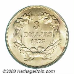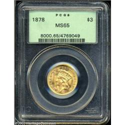 <table><tr><td><TABLE cellSpacing=0 cellPadding=0 width="100%" bgColor=#000000 border=0><TBODY> <TR><TD width="100%"><TABLE cellSpacing=1 cellPadding=3 width="100%" border=0><TBODY><TR><TD width="100%" bgColor=#79735c><FONT face=arial color=#ffffff size=3><B>Description</B> </FONT></TD></TR><TR><TD width="100%" bgColor=#ffffff><FONT face=arial size=2><B>1878 $3 MS65 PCGS.</B></I> By far, the most frequently seen date in the Three Dollar series, the 1878 is a natural for type purposes. In MS65 condition, it is one of the most enchanting gold type coins from the 19th century. The surfaces on this piece exude thick mint frost, the type of frost that swirls around each side as only seen on 1878 Threes. The nearly flawless coin shows a slight overlay of reddish patina on each side. An exemplary Three Dollar Gold Piece.<BR><I>From the Holman Family Collection.</B></I> </FONT></TD></TR></TBODY></TABLE></TD></TR></TBODY></TABLE><BR><A name=PricesRealized></A><TABLE cellSpacing=0 cellPadding=0 width="100%" bgColor=#000000 border=0><TBODY><TR><TD width="100%"><TABLE cellSpacing=1 cellPadding=3 width="100%" border=0><TBODY><TR><TD width="100%" bgColor=#79735c><A name=PR><FONT face=arial color=#ffffff size=3><B>Previous Prices from Heritage Auctions</B> </FONT></A></TD></TR><TR><TD bgColor=#f6f6ed><TABLE cellSpacing=0 cellPadding=0 width="100%" border=1><TBODY><TR><TD align=middle width="33%"><B>Date</B></TD><TD align=middle width="33%"><B>Service</B></TD><TD align=middle width="33%"><B>Price</B></TD></TR><TR bgColor=whitesmoke><TD width="33%"><B>03/01/2003</B></TD><TD width="33%">PCGS</TD><TD width="33%">$7,762.50</TD></TR><TR bgColor=whitesmoke><TD width="33%"><B>10/06/2000</B></TD><TD width="33%">PCGS</TD><TD width="33%">$7,130.00</TD></TR><TR bgColor=whitesmoke><TD width="33%"><B>09/23/1998</B></TD><TD width="33%">PCGS</TD><TD width="33%">$9,625.00</TD></TR><TR bgColor=whitesmoke><TD width="33%"><B>02/16/2000</B></TD><TD width="33%">PCGS</TD><TD width="33%">$8,357.00</TD></TR><TR bgColor=whitesmoke><TD width="33%"><B>08/09/2000</B></TD><TD width="33%">PCGS</TD><TD width="33%">$8,050.00</TD></TR><TR bgColor=whitesmoke><TD width="33%"><B>03/01/2001</B></TD><TD width="33%">NGC</TD><TD width="33%">$5,750.00</TD></TR><TR bgColor=whitesmoke><TD width="33%"><B>10/01/1990</B></TD><TD width="33%">PCGS</TD><TD width="33%">$17,600.00</TD></TR><TR bgColor=whitesmoke><TD width="33%"><B>02/01/1991</B></TD><TD width="33%">PCGS</TD><TD width="33%">$15,950.00</TD></TR><TR bgColor=whitesmoke><TD width="33%"><B>08/01/1990</B></TD><TD width="33%">NGC</TD><TD width="33%">$17,600.00</TD></TR><TR bgColor=whitesmoke><TD width="33%"><B>01/01/1990</B></TD><TD width="33%">PCGS</TD><TD width="33%">$24,200.00</TD></TR><TR bgColor=whitesmoke><TD width="33%"><B>08/01/1990</B></TD><TD width="33%">PCGS</TD><TD width="33%">$19,800.00</TD></TR></TBODY></TABLE></TD></TR><TR><TD bgColor=#ffffff><FONT face=arial size=1 ?>PLEASE NOTE: All prices realized reflect the final hammer price PLUS the buyer's premium in auctions that charge a buyer's premium. Each item has a notation at the top of the listing indicating whether that lot included a buyer's premium. Example: A item that sells with a final hammer price of $100 and a 20% buyer's premium will display with a price realized of $120. All information listed is intended to be as accurate as possible, but errors are possible. Please use this guide carefully and inform us of any inaccuracies. </FONT></TD></TR></TBODY></TABLE></TD></TR></TBODY></TABLE><BR><TABLE cellSpacing=0 cellPadding=0 width="100%" bgColor=#000000 border=0><TBODY><TR><TD width="100%"><TABLE cellSpacing=1 cellPadding=3 width="100%" border=0><TBODY><TR><TD width="100%" bgColor=#79735c colSpan=6><FONT face=arial color=#ffffff size=3><B>Price Guide*</B> </FONT></TD></TR><TR bgColor=#f6f6ed><TD align=middle><B>Grade</B> </TD><TD align=middle><B>Coin World<BR>(Trends)</B> </TD><TD align=middle><B>Numismedia<BR>Retail</B> </TD><TD align=middle><B>Numismedia<BR>Wholesale</B> </TD><TD align=middle><B>Coin<BR>Universe</B> </TD><TD align=middle><B>Heritage<BR>Value Index</B> </TD></TR><TR bgColor=#ffffff><TD align=middle>64</TD><TD align=right>$6,000.00</TD><TD align=right>---</TD><TD align=right>$4,900.00</TD><TD align=right>$6,150.00</TD><TD align=right>$4,465.00</TD></TR><TR style="FONT-WEIGHT: bold" bgColor=#cccfdd><TD align=middle>65</TD><TD align=right>$12,000.00</TD><TD align=right>---</TD><TD align=right>$7,850.00</TD><TD align=right>$11,500.00</TD><TD align=right>$7,708.75</TD></TR><TR bgColor=#ffffff><TD align=middle>66</TD><TD align=right>---</TD><TD align=right>---</TD><TD align=right>$12,500.00</TD><TD align=right>$19,000.00</TD><TD align=right>$18,271.25</TD></TR><TR bgColor=#ffffff><TD colSpan=6><FONT size=1>*All information listed is intended to be as accurate as possible, but errors are possible. No item may be returned or refused based on this information which is provided as a service to our customers. You should contact each pricing source directly to determine the accuracy of this information. </FONT></TD></TR></TBODY></TABLE></TD></TR></TBODY></TABLE><BR><TABLE cellSpacing=0 cellPadding=0 width="100%" bgColor=#000000 border=0><TBODY><TR><TD width="100%"><TABLE cellSpacing=1 cellPadding=3 width="100%" border=0><TBODY><TR><TD width="100%" bgColor=#79735c><FONT face=arial color=#ffffff size=3><B>Population Guide</B> </FONT></TD></TR><TR bgColor=#ffffff><TD align=middle><!-- Begin Output of Population Grid--><TABLE cellSpacing=0 cellPadding=0 width="100%" border=0><TBODY><TR><TD vAlign=center><TABLE cellSpacing=0 width="100%" border=1 cellsadding="3"><TBODY><TR><TD vAlign=center><TABLE cellSpacing=0 cellPadding=3 width="100%" border=1><TBODY><TR><TD vAlign=center align=middle bgColor=#f0f1e8 colSpan=2 <CENTER><FONT face=Arial size=2><B>PCGS Pop </B></FONT><CENTER></CENTER></TD><TD vAlign=center align=middle bgColor=#f0f1e8 colSpan=2><CENTER><FONT face=Arial size=2><B>NGC Pop</B></CENTER></FONT></TD></TR><TR><T
