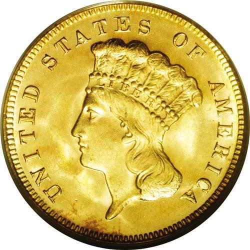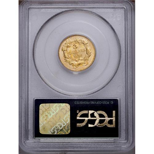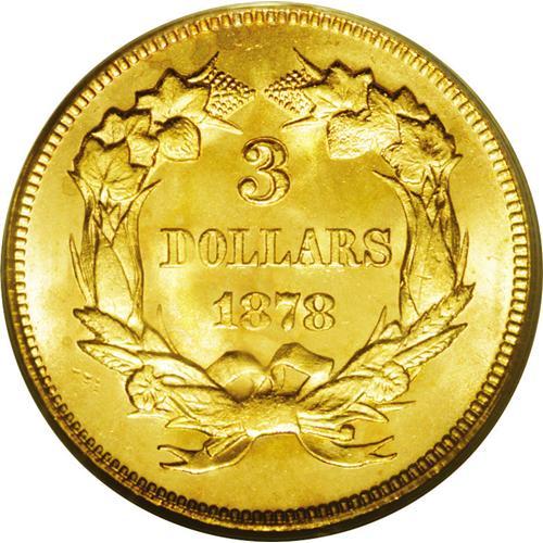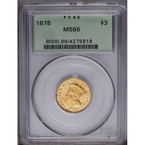 <B>1878<$3> MS66 PCGS.</B></I> Lodged between two low mintage dates of 1,468 pieces and 3,000 pieces respectively, the three dollar gold denomination was inexplicably returned to near-record production (only the initial year 1854 is higher) in 1878, a comparatively large total of 82,304 business strikes. As a result, it is the one of the more obtainable dates in the series in any condition, including desirable, seldom-offered Gem and better grades. Its importance as a type coin, however, far overshadows any date pressure, as the total number of carefully preserved examples is extremely limited.<BR> This dazzling Premium Gem example is notable for its radiant cartwheel luster and excellent strength of strike. A few isolated splashes of coppery-gold and steel-blue patina are seen over surfaces that have escaped all but the most trivial signs of contact. It would take a diligent search to locate a three dollar gold type coin with finer technical and aesthetic merit. Population: 59 in 66, 7 finer (4/06).