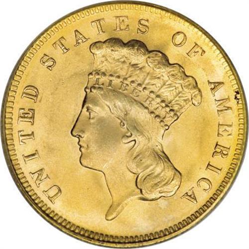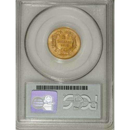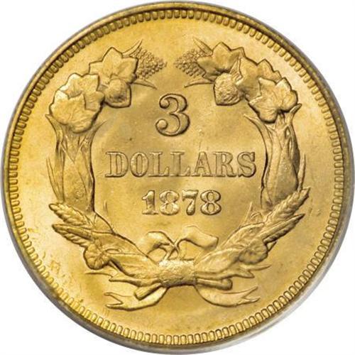<B>1878 $3 MS66 PCGS.</B></I> A beautiful orange-gold Premium Gem that boasts coruscating luster and a precise strike. Abrasions are so negligible as to be unworthy of further comment. A few glimpses of milk-white patina confirm the originality. The reverse is lightly die doubled, most noticeably on the outer edges of the right-side cotton leaves and on the right edges of the ARS in DOLLARS. In addition, the upper loops of both 8s in the date show noticeable repunching. The 1878 has the largest mintage of the large DOLLARS subtype, because the Treasury believed the denomination would return to circulation in 1878 after years of gold coin hoarding. By 1878, however, citizens were accustomed to paper money, and the remaining three dollar dates witnessed minimal productions. Population: 62 in 66, 7 finer (11/07).<BR><I>From The Madison Collection.</B></I><BR><BR><B>Coin Engraver:</B> James B. Longacre<BR><BR><b>Shipping:</b> Coins & Currency (<a target="_blank" href="http://www.heritageauctions.com/common/shipping.php">view shipping information</a>)