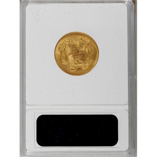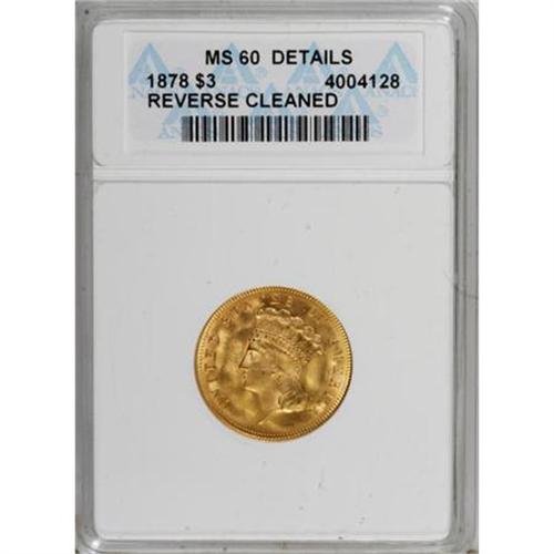 <B>1878 $3 --Reverse Cleaned--ANACS. MS60 Details.</B></I> A piece that displays beautifully, this well struck type example has swirling luster and pleasing wheat-gold obverse surfaces. By contrast, the mustard-gold fields of the reverse are dulled from cleaning.<BR><BR><B>Coin Engraver:</B> James B. Longacre<BR><BR><b>Shipping:</b> Coins & Currency (<a target="_blank" href="http://www.heritageauctions.com/common/shipping.php">view shipping information</a>)