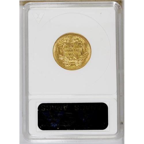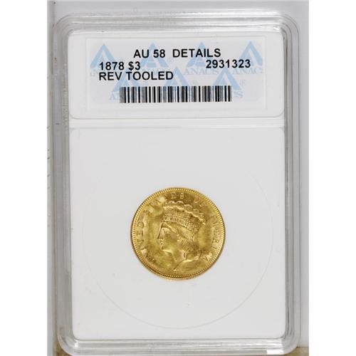 <B>1878 $3 --Reverse Tooled--ANACS. AU58 Details.</B></I> Bright yellow-gold surfaces retain ample luster, and exhibit well impressed design elements. A patch of hairline-like marks are located in the upper reverse, and a few minor scrapes are noted along the right reverse border. Despite these minor impairments, this is a relatively attractive coin.<BR><BR><b>Shipping:</b> Coin/Currency (<a target="_blank" href="http://www.heritageauctions.com/common/shipping.php">view shipping information</a>)