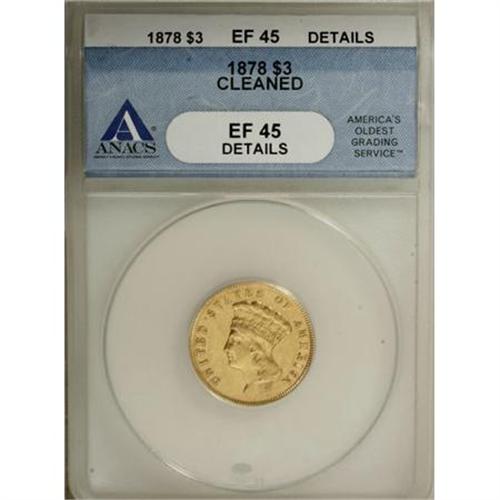 <B>1878 $3 --Cleaned--ANACS. XF45 Details. </B></I> Well struck with minimal wear for the XF45 net grade. There are numerous paper-thin hairlines on each side, that testify to an old cleaning, but larger marks are not in evidence. <BR><BR><B>Coin Engraver:</B> James B. Longacre<BR><BR><b>Shipping:</b> Coins & Currency (<a target="_blank" href="http://www.heritageauctions.com/common/shipping.php">view shipping information</a>)