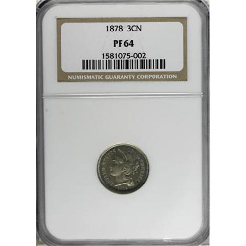 <B>1878 3CN PR64 NGC.</B></I> A solidly struck and highly appealing Choice representative from this proof-only issue of 2,350 pieces. Golden-tan patina drapes the lightly hairlined surfaces, and a planchet flaw appears to the right of OF in the obverse legend.<BR><BR><B>Coin Engraver:</B> James B. Longacre<BR><BR><b>Shipping:</b> Coins & Currency (<a target="_blank" href="http://www.heritageauctions.com/common/shipping.php">view shipping information</a>)
