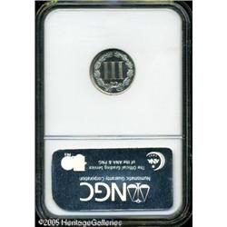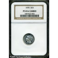 <B>1878 3CN PR65 <img border='0' src='http://www.heritagecoins.com/images/star.gif' width=10 height=10> Cameo NGC.</B></I> The 1878 is an important proof-only year in the three cent nickel series with a mintage of only 2,350 pieces. This is certainly an exemplary striking that shows deeply reflective fields, as evidenced by the "broken nose" on Liberty from excessive die polishing. Brilliant throughout, this fully struck coin is clearly suggestive of an even higher grade. Lot:5806