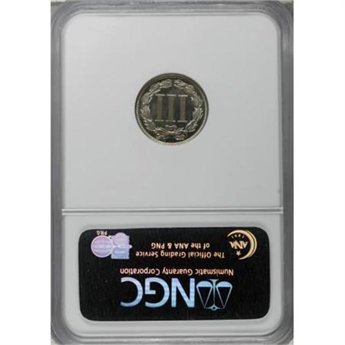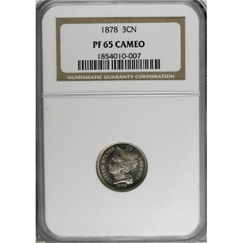 <B>1878 3CN PR65 Cameo NGC.</B></I> The 1877 and 1878 proof-only issues are the keys to the popular three cent nickel series, and Gem survivors experience heavy demand from both series specialists and type collectors. This coin shows bold contrast and a hint of golden patina over the well-preserved surfaces. A long, interesting, straight die line runs from the rear of Liberty's hair, just above the bun, onto her cheek. Census: 32 in 65, 50 finer (7/07).<BR><BR><b>Shipping:</b> Coins & Currency (<a target="_blank" href="http://www.heritageauctions.com/common/shipping.php">view shipping information</a>)