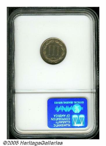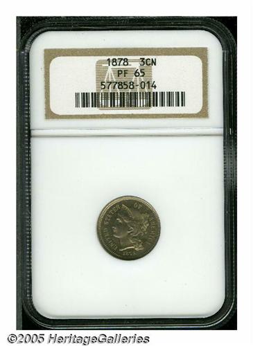 <B>1878<3CN> PR65 NGC.</B></I> An always-popular issue, this golden-gray Gem displays more or less contrast between the fields and devices depending on light angle. Problem-free, as befits the grade. Interestingly, the bridge of Liberty's nose has been removed by excessive die polishing.