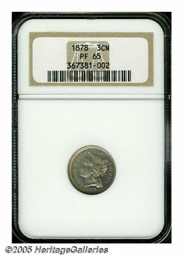 <B>1878<3CN> PR65 NGC.</B></I> Well struck with substantial reflectivity in the fields and unmarked, expertly preserved surfaces. The bridge of Liberty's nose appears to have been removed by excessive die polish, and there are a couple of minor spots on the surfaces.