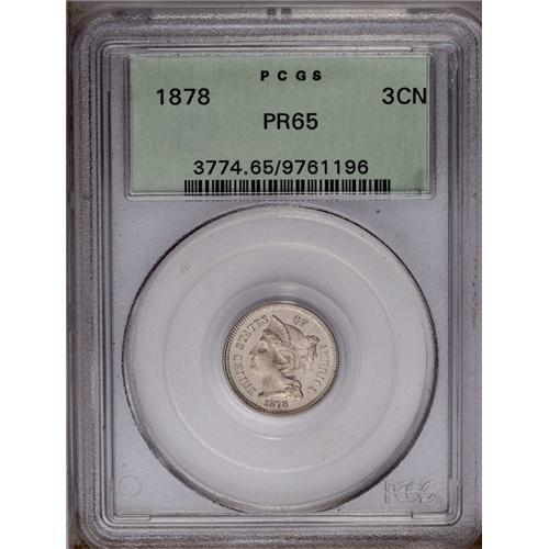 <B>1878<3CN> PR65 PCGS.</B></I> A razor-sharp, gently toned, and unabraded Gem. A few pinpoint carbon flecks are distributed but do not distract. This proof-only piece is encapsulated in a green label holder.