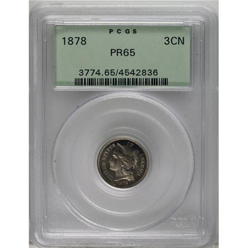 1878 3CN PR65 PCGS. Crisply detailed with smooth, ivor