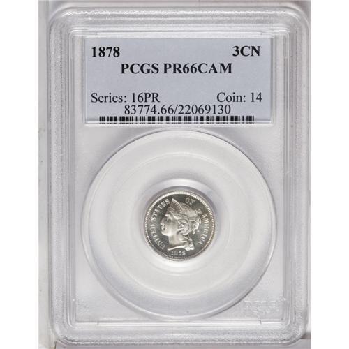 <B>1878<3CN> PR66 Cameo PCGS.</B></I> A great strike and pristine surfaces promote the Premium Gem grade assessment. Add frosted devices and sharply reflective fields and the Cameo designation seems fully warranted. A lovely specimen from this proof-only mintage of 2,350 pieces. Population: 56 in 66 Cameo, 6 finer (8/06).