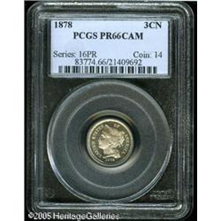<B>1878 3CN PR66 Cameo PCGS.</B></I> A proof-only year, with a mintage of only 2,350 pieces. This is an essentially untoned coin, with good frosting on the devices and deeply mirrored fields. It is also the second-scarcest date in the series. Population: 44 in 66, 4 finer (1/05).<BR><I>From The Mike Jacobson Collection.</B></I> Lot:5747