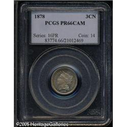 <B>1878 3CN PR66 Cameo PCGS.</B></I> Dusky gray color with attractive iridescent toning on both sides, all over pleasing Proof surfaces. The fields are lightly reflective while the devices are frosty and lustrous. A lovely example and one of few that qualify as Cameo examples. Population: 44 in 66, 4 finer (1/05). Lot:5807