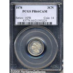 <B>1878 3CN PR66 Cameo PCGS.</B></I> Dynamic gold and champagne-rose colors embrace both sides of this boldly struck specimen. A few miniscule carbon flecks preclude perfection. A proof-only issue. Population: 45 in 66 Cameo, 4 finer (2/05).