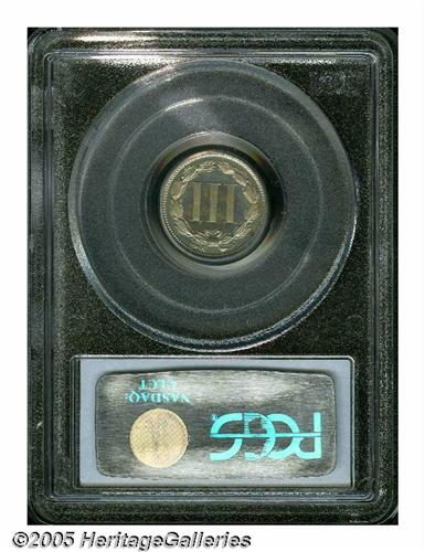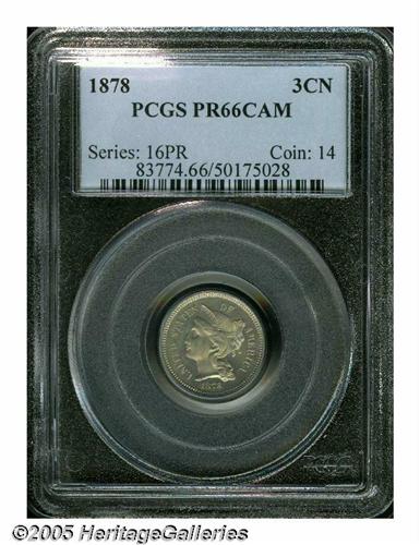 <B>1878<3CN> PR66 Cameo PCGS.</B></I> Pale gray, deeply reflective field show an overlay of light iridescent toning with frosty devices. This is a sharply struck and highly attractive example of this popular proof-only issue, and an important date for the collector who is assembling a date run of three cent nickels. Population: 45 in 66, 4 finer (3/05).
